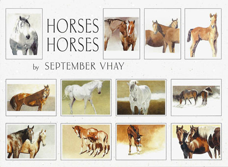 September Vhay paints full-time from her Wyoming home. Her interest and admiration of native wildlife and horses inspire her graceful paintings of animals and birds. Raised in Nevada, September’s paintings feature the muted colors of the western desert and grasslands. Her oils and watercolors can be seen in galleries in Wyoming, Utah, and New Mexico.